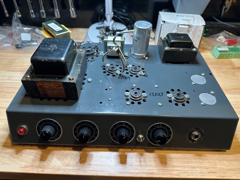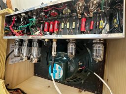 What was once a Newcomb Pathfinder PA Amplifier from the 1960s is now an 18W utilizing the original transformers. The single channel TMB circuit has a passive effects loop and Tung Sol tubes.